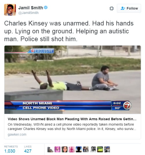 Charles Kinsey, 47, a behavior therapist from South Florida was shot in the leg three times by the police in North Miami while laying on the ground with his arms up and trying to help his patient with autism who had run away from a group home.